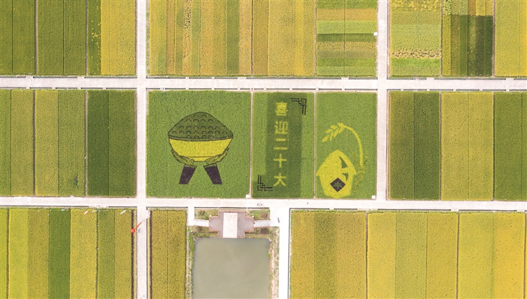 昨日,记者来到市良种繁育场,通过无人机从空中俯瞰,只见由“喜迎二十大”文字以及“捧牢饭碗”“颗粒归仓”图案组成的巨幅“稻田画”格外醒目,气势恢宏。