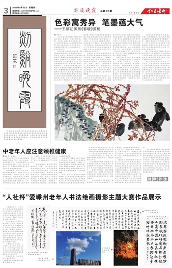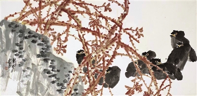 前段时期,王炳初老师给我看一幅《春暖》的国画作品,这是他的代表作,既有花,也有鸟。画面的左方是数枝刚抽芽的月季嫩枝,浓淡相融的赭红色月季嫩枝,正抽叶探头,茁壮成长。作者以夸张的手法,让月季的嫩枝从山石后面延伸到画面的中央,穿插有致,充盈在画面的中心。作者用笔刚健浑厚,如龙蛇游弋;用色如春日朝霞,绚丽斑斓,呈现出一派翻腾雄浑恣肆的阳刚之气。画面的右方是六只八哥,作者以熟练的笔墨功夫,用浓淡的墨色来表现八哥的动态,看似不经意,实则精心安排,调剂着画面黑白空间。你看,八哥或站立或匍匐,间杂在月季的嫩枝中,具有鲜明的韵律感。特别是八哥前额那长而竖直的冠状羽簇、乳黄色嘴夹以及闪亮灵动的眼睛,作者用白描的手法勾勒出来,十分到位。它们正沐浴在暖暖的春阳下,互相依偎,左右顾盼,一股生动的春暖气韵扑面而来。画家借点线的运动、组合、变化来表达自己的造型意趣,审美情操,抒发个人特有的情思意兴,给人以醇而美的艺术享受。