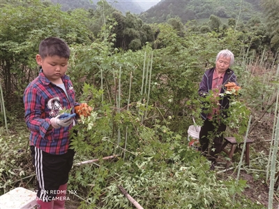 瑞娟大妈的儿子和儿媳外出做小笼包,平时她就在家里送孙子上下学。近几年来,她在田里种植了一些覆盆子,每年收入不错。她说人虽辛苦一些,但有这么好的收成,心里觉得很开心。图为瑞娟大妈和小孙子采覆盆子的场景。