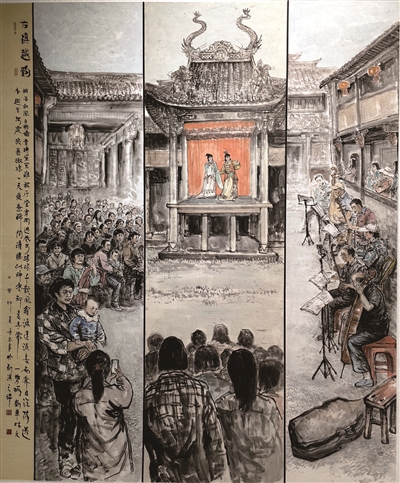 张顺忠老师指着画面告诉我说:“这幅画是表现崇仁古镇老百姓的文化生活,在镇政府的安排下,每个星期六的下午都有越剧折子戏在玉山公祠演出,不仅受到当地老百姓的喜爱,还吸引了很多游客前来观看。我针对这种面貌,决定创作一幅《古镇越韵》的作品,来表现演出的盛况。为能让作品容纳更多的内容,我用国画三联画的形式来表现,即从三个层面来表现舞台演出、乐队伴奏及群众观看的场景。为了能创作好这幅作品,我多次去玉山公祠拍摄演出的实况,观察不同的人物形象和不同的角色及乐队的位置安排。我以传统的笔墨表现了三幅不同的画面,正面是剧团演员在古老戏台上演出的场景,左面是观众观看演出的场景,右面是乐队伴奏的场景,三种场景有机地结合在一起,形成一个整体。而背景则是玉山公祠的全貌,描述前庭、厢房与道地的建筑风貌,特别是古戏台上面的建筑装饰,力求真实。使画面古朴,典雅,大气。场景与人物达到虚实相间,该实的地方实,如台下观众观看演出的近景、乐队伴奏员的神态;该虚的地方虚,如后面观看演出的人群、宗祠上方的雕刻、厢房的建筑等。使整幅画面虚实互映,达到统一、整体、生动的效果。”